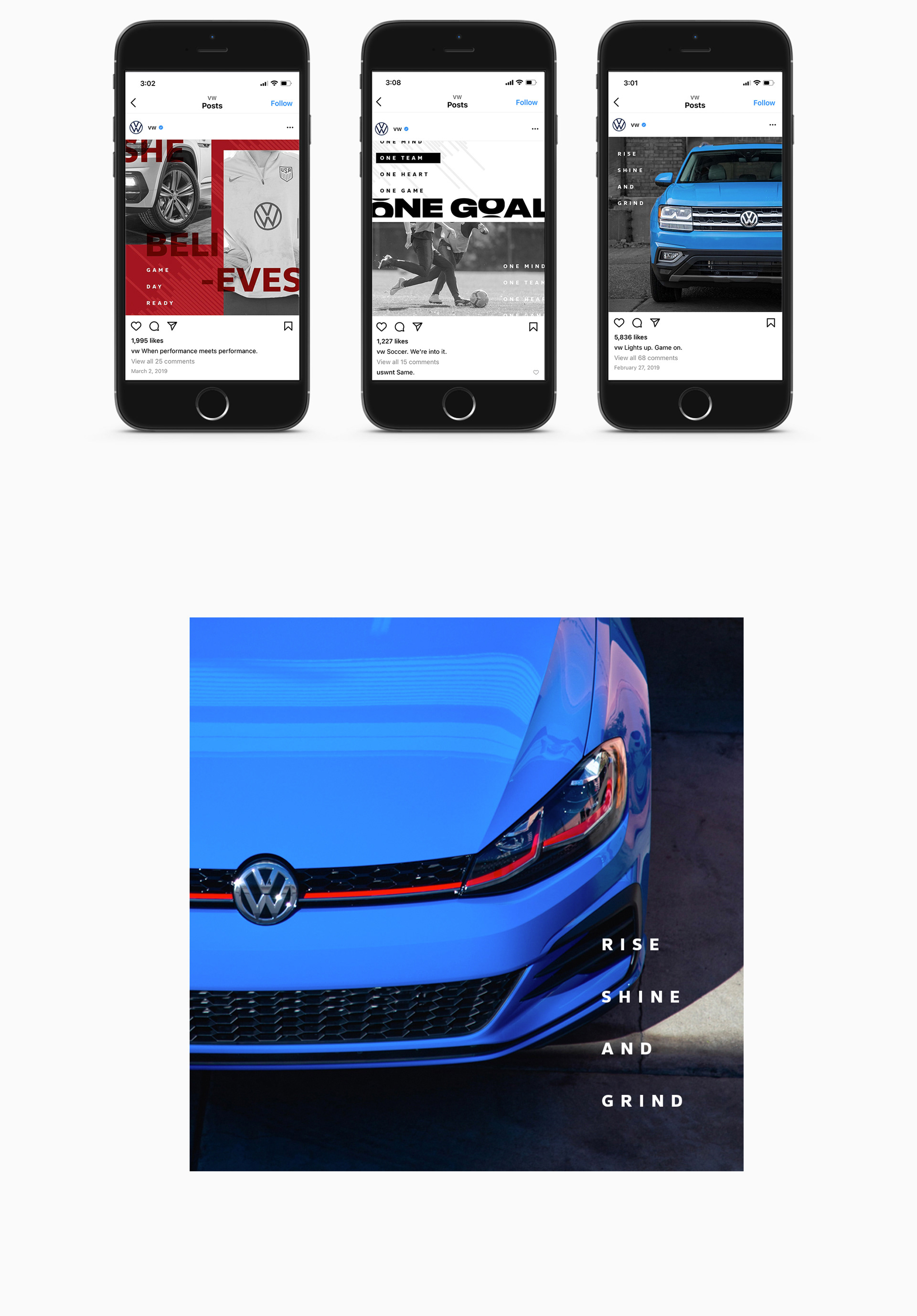 VW's Social Team provided creative and visual direction for VW x U.S. Soccer's partnership for VW's social media channels. My role in this process ranged from establishing the overall look & feel, designing graphics for social, assisting in production for sponsored video ads, and producing motion graphic videos.